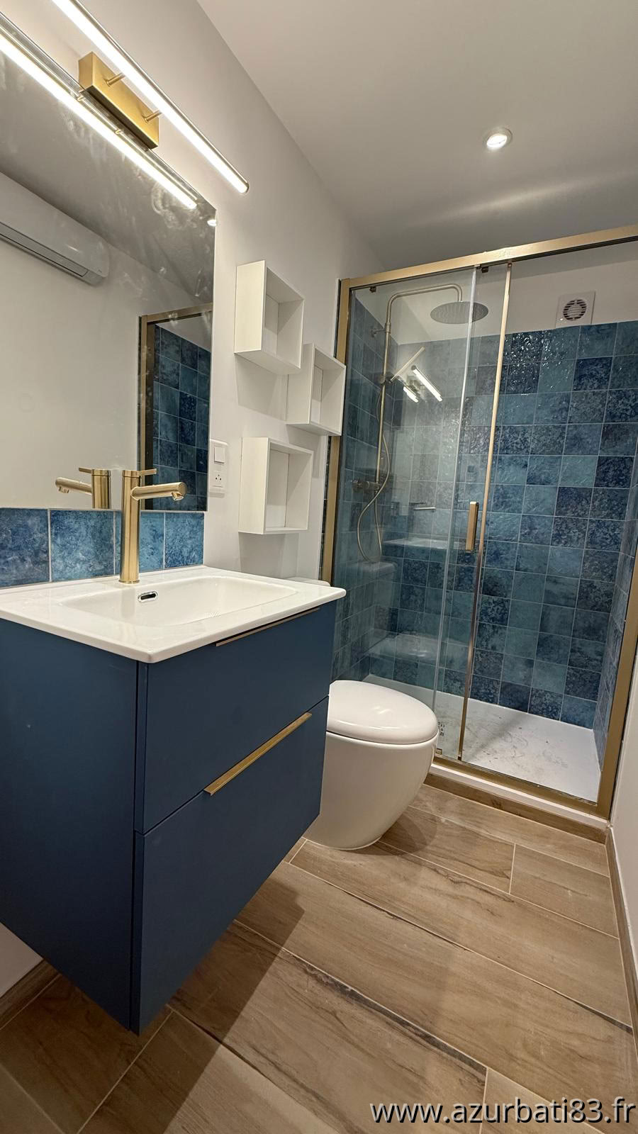 Alimentation en eau : Nous installons un réducteur de pression (type Watts) réglé à 3 bars – protège les robinetteries fines (comme l’or brossé de notre projet) de l’usure prématurée. En amont, un adoucisseur compact (type Culligan) évite l’entartrage des colonnes de douche et chauffe-eau. À Saint-Raphaël, où l’eau est très calcaire, cet investissement évite des interventions coûteuses à 2 ans.